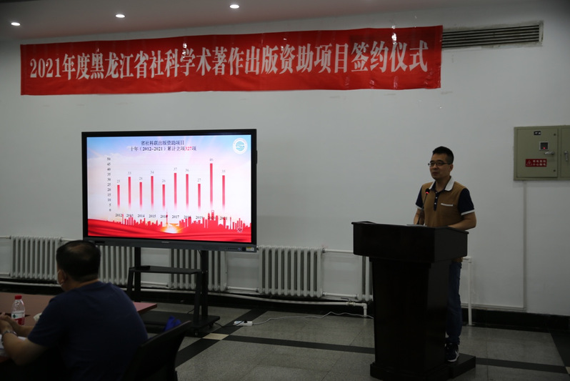 签约仪式由省社科联学会工作部部长、一级调研员曹妍主持,首先介绍了2021年度黑龙江省社会科学学术著作出版资助项目评审工作的相关情况。随后,省社科联党组成员、副主席王宏宇教授向参会人员介绍了历年黑龙江省社会科学学术著作出版资助项目的出版情况及三方协议签订的相关事项。