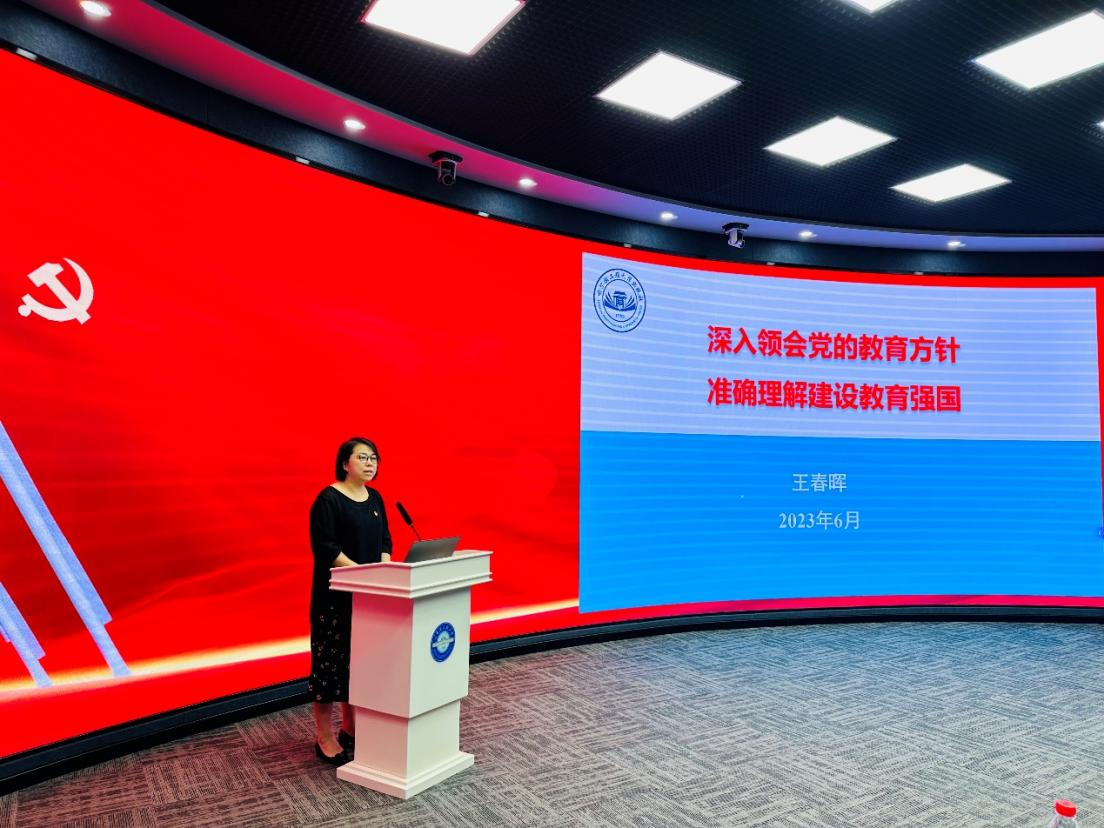 出版社党支部书记、社长王春晖以《深入领会党的教育方针 准确理解建设教育强国》为题讲授党课。她从党的教育方针的历史溯源、中心议题、贯彻落实三方面讲起,就出版社申报智库情况、融合出版情况、文创产品情况进行介绍。