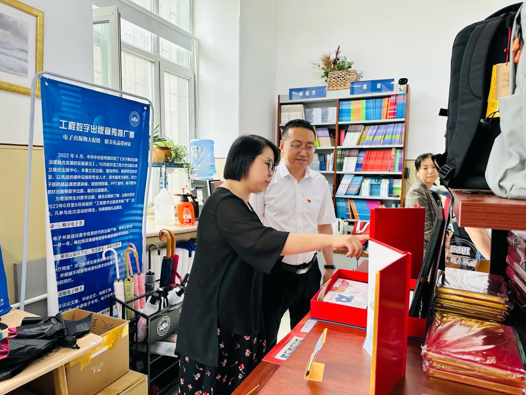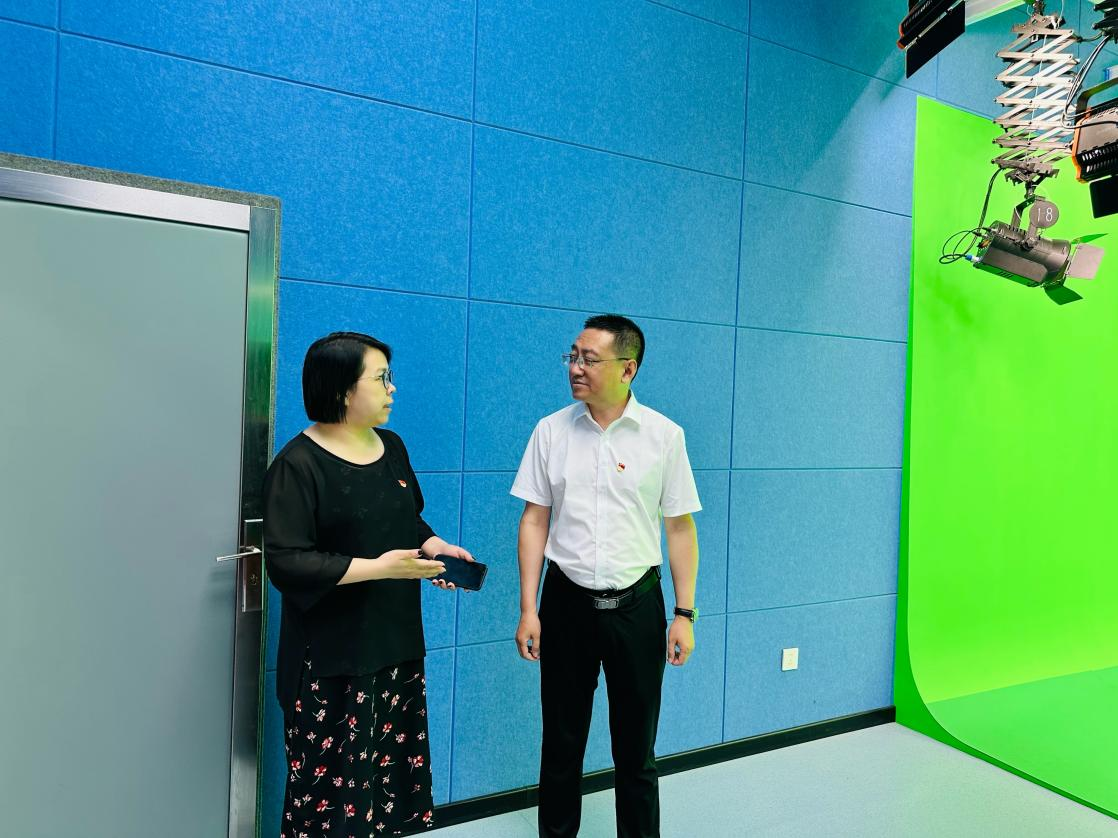 档案馆党支部书记、馆长刘振宇到出版社融合出版中心虚拟演播室、智慧教室调研,并参观出版社文创产品展示区。