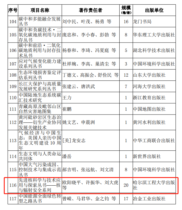 为科学有效实施“十四五”国家重点出版物出版规划,推动出版业高质量发展,国家新闻出版署经评审论证,日前确定公布了“十四五”国家重点出版物出版规划增补项目。我社“先进核科学与技术应用与探索丛书——核与辐射安全系列”项目成功入选“十四五”国家重点出版物出版规划。