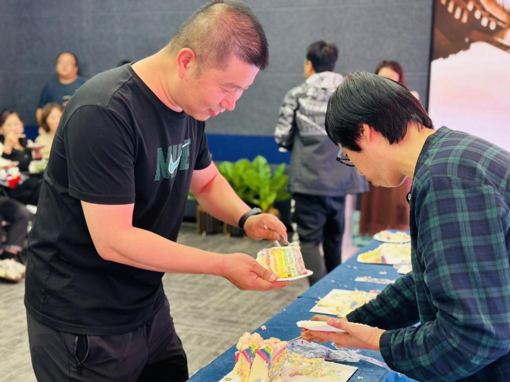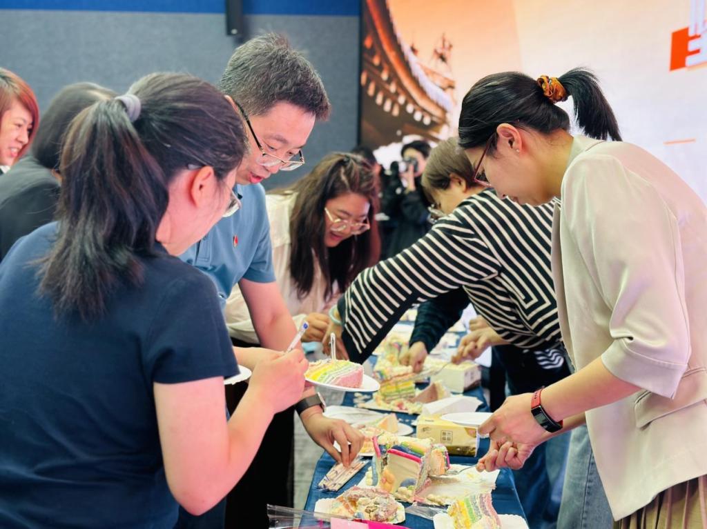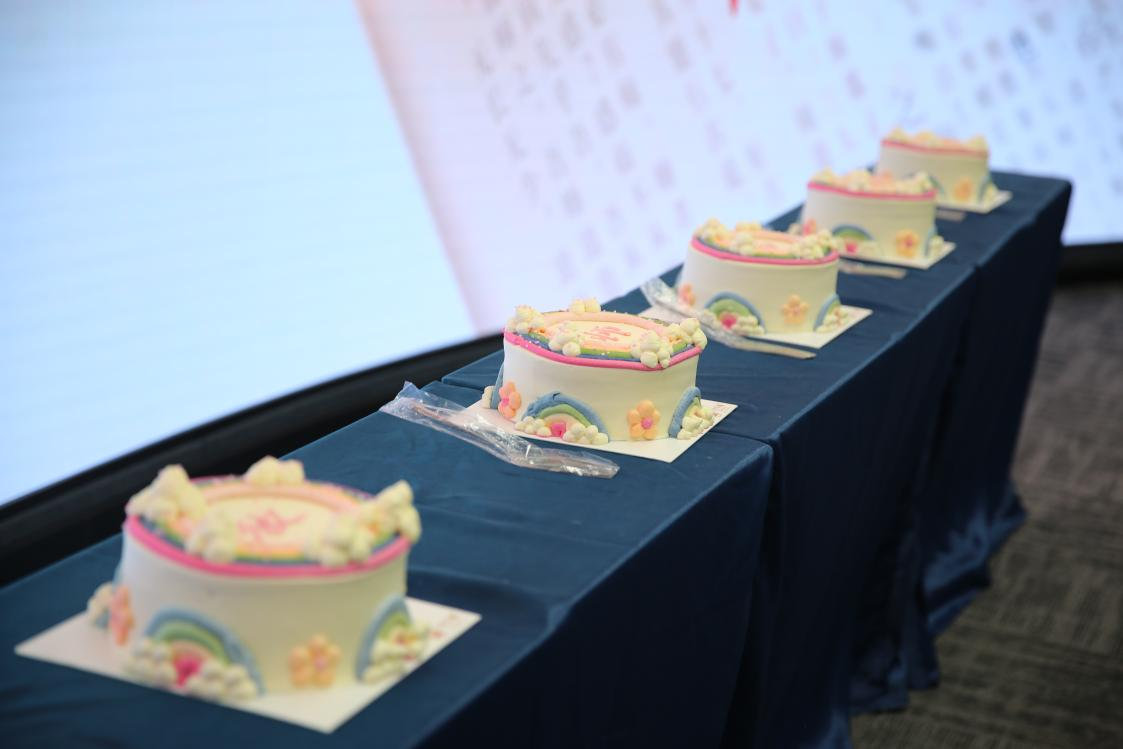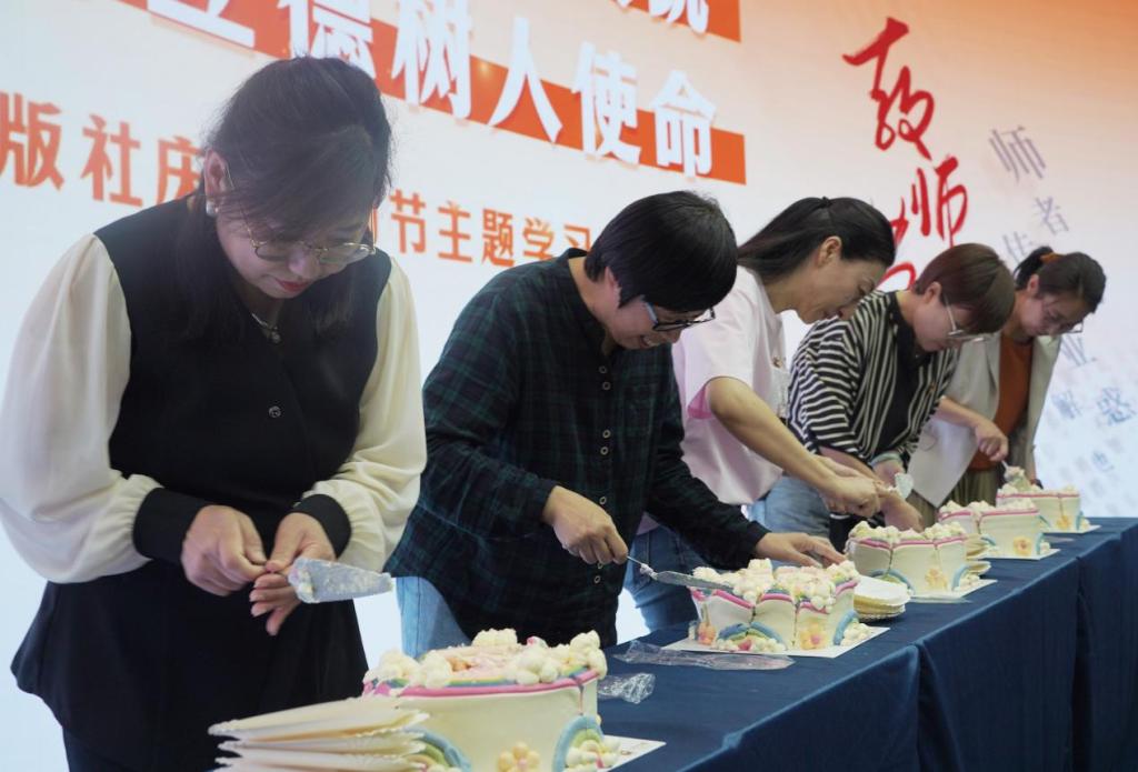 随后,全体人员来到融合出版中心云端报告厅,五个写着“教师节快乐”的蛋糕一字排开,仪式感拉满。
