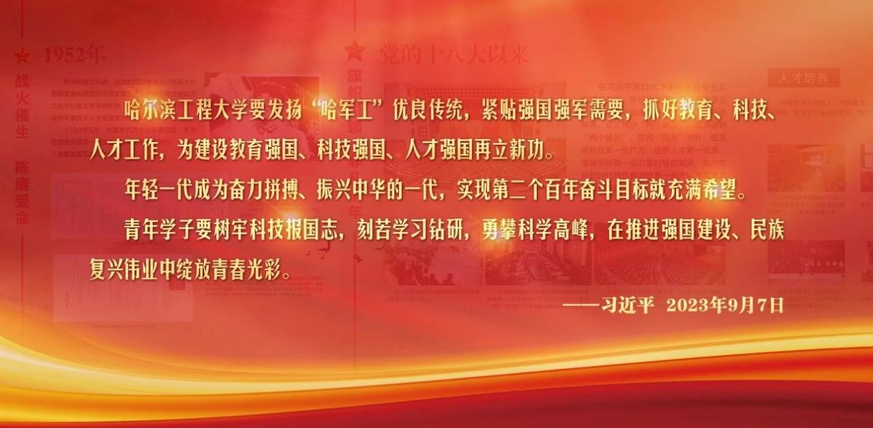 9月7日上午,习近平总书记亲临哈尔滨工程大学视察,走进哈军工纪念馆。习近平总书记强调,哈尔滨工程大学要发扬“哈军工”优良传统,紧贴强国强军需要,抓好教育、科技、人才工作,为建设教育强国、科技强国、人才强国再立新功。
