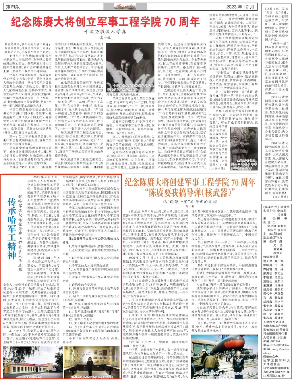 近日,《军工之光报》2023年第四期第四版刊发文章,对哈尔滨工程大学出版社社长、哈军工纪念馆筹建工作负责人王春晖,潜心投身哈军工精神与文化传播的事迹进行了报道。