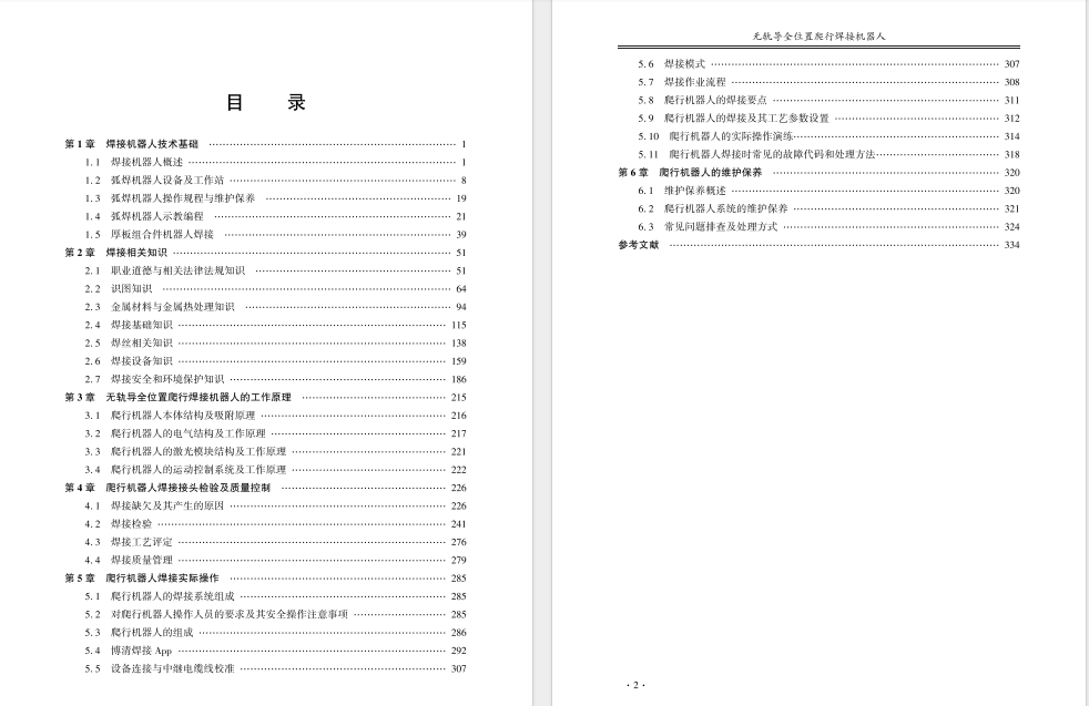 本书综述了焊接机器人技术基础、焊接相关知识,无轨导全位置爬行焊接机器人的工作原理、焊接接头检验及质量控制,同时概述了机器人的维护保养等内容,可使读者快速使用无轨导全位置爬行焊接机器人,以满足自动化焊接领域特殊焊接岗位的需求。