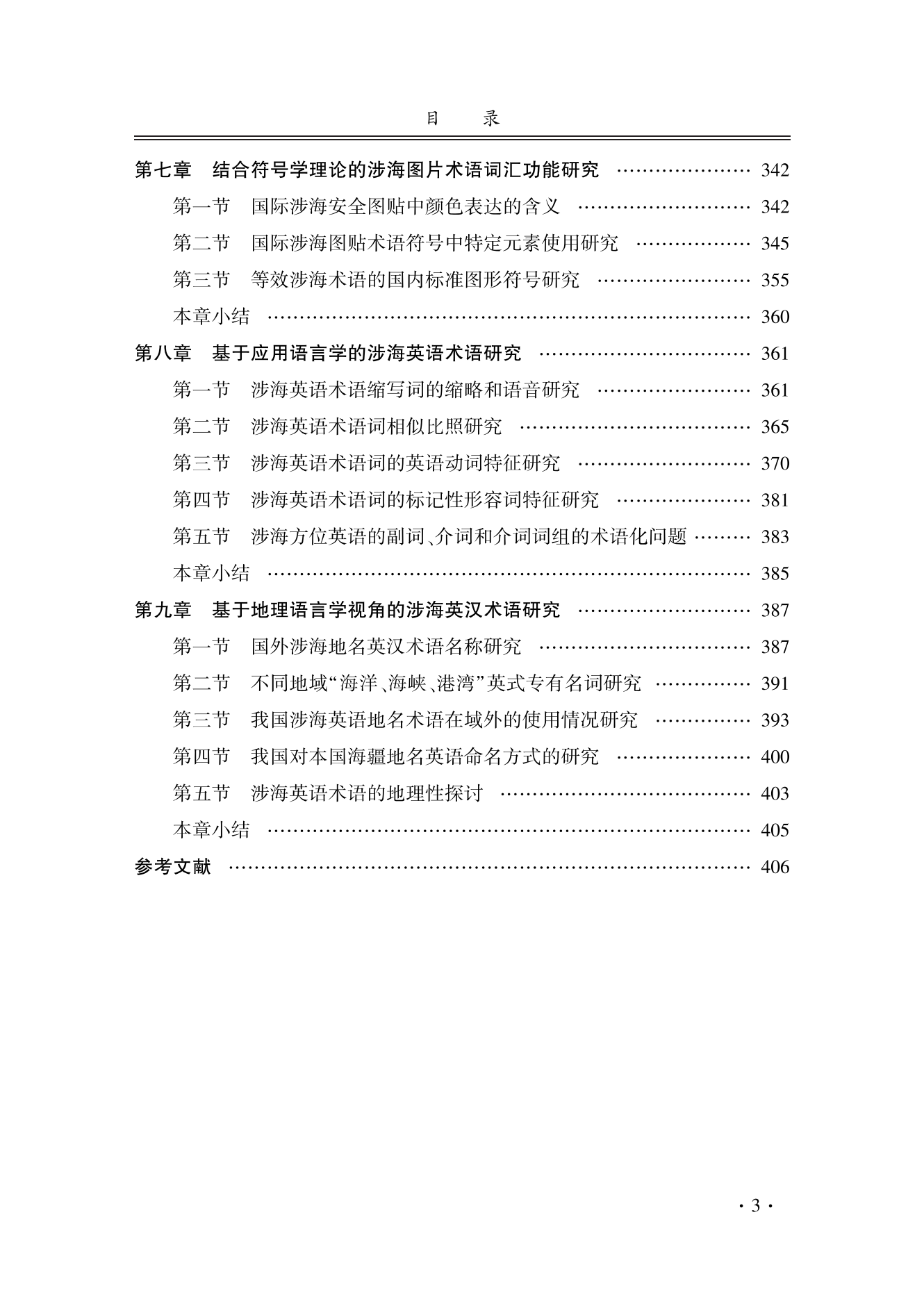 涉海术语学属于特殊术语学的范畴之一,是特殊术语学理论及特殊术语名词组织与管理领域的创新之作。《涉海术语学研究》以涉海学科为研究对象,研究涉海术语学的概念基础、涉海术语学科涉及的名词管理机构及涉海术语学的管理、涉海术语词汇的传播特征;该著作还总结了作者在国际海事公约中的定义与在我国涉海术语应用方面的研究成果;并从认知语言学、社会语言学、符号学、应用语言学、地理术语学等多角度研究涉海术语。书中既有涉海术语学理论、又有具体术语词汇的分析案例,是从多角度研究涉海术语学的研究著作。