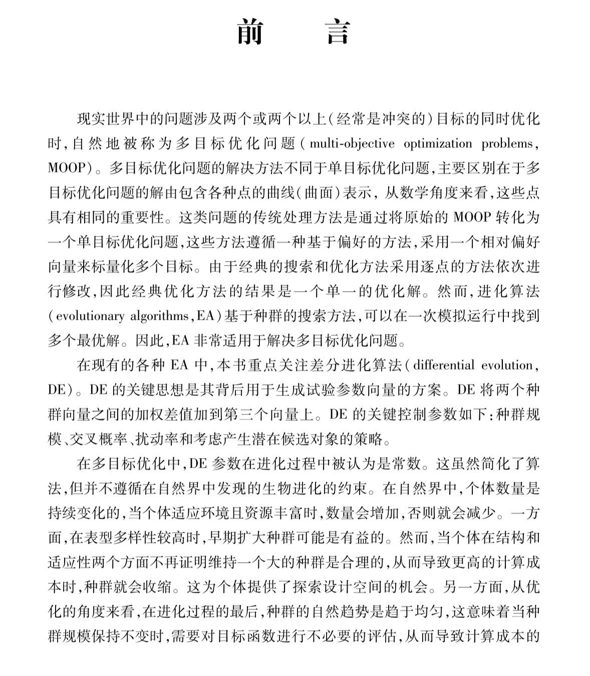 在传统的多目标优化算法中,进化算法所需的最关键参数值在进化过程中通常被认为是恒定的。虽然这一简化处理可以取得良好的计算结果,但是仍然存在过早收敛及对参数选择敏感等问题。本书介绍了一种自适应多目标优化差分进化算法,即在进化过程中动态更新差分进化的关键控制参数,可以有效减少目标函数的评价次数,实现多目标优化问题的高效求解;阐述了该方法应用于不同复杂程度的数学函数和工程系统设计问题中的测试案例,以及全面详细的算法对比结果。差分进化算法的关键控制参数有种群规模(population size,NP)、交叉率(crossover rate,CR)、扰动率(perturbation rate,F),以及用于生成解决优化问题的潜在候选对象的策略类型。