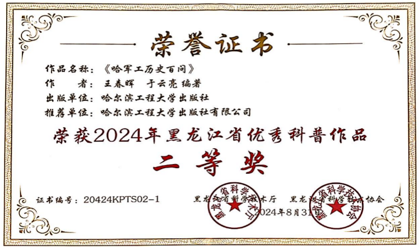 近日,黑龙江省科学技术厅、黑龙江省科学技术协会发布2024年黑龙江省优秀科普作品名单。由哈尔滨工程大学出版社出版的图书《哈军工历史百问》荣获2024年黑龙江省优秀科普图书二等奖;出版的微视频《循梦环铀记》经由中共黑龙江省委宣传部推荐荣获2024年黑龙江省优秀科普微视频二等奖。