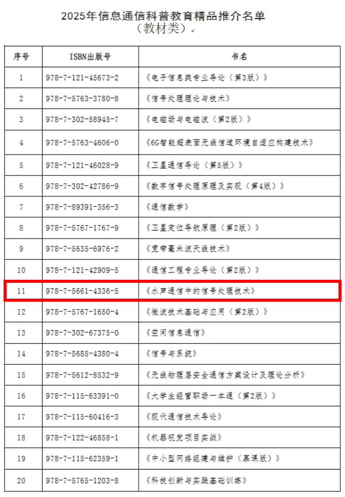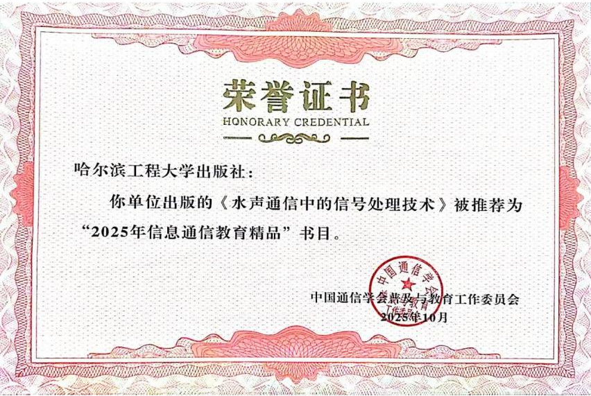 近日,中国通信学会公布了“2025年信息通信科普教育精品推介名单”。由我校水声工程学院教师殷敬伟、韩笑、魏笠、葛威等教师共同编著的《水声通信中的信号处理技术》一书成功入选。全国仅20本,该书是水声领域唯一入选教材。