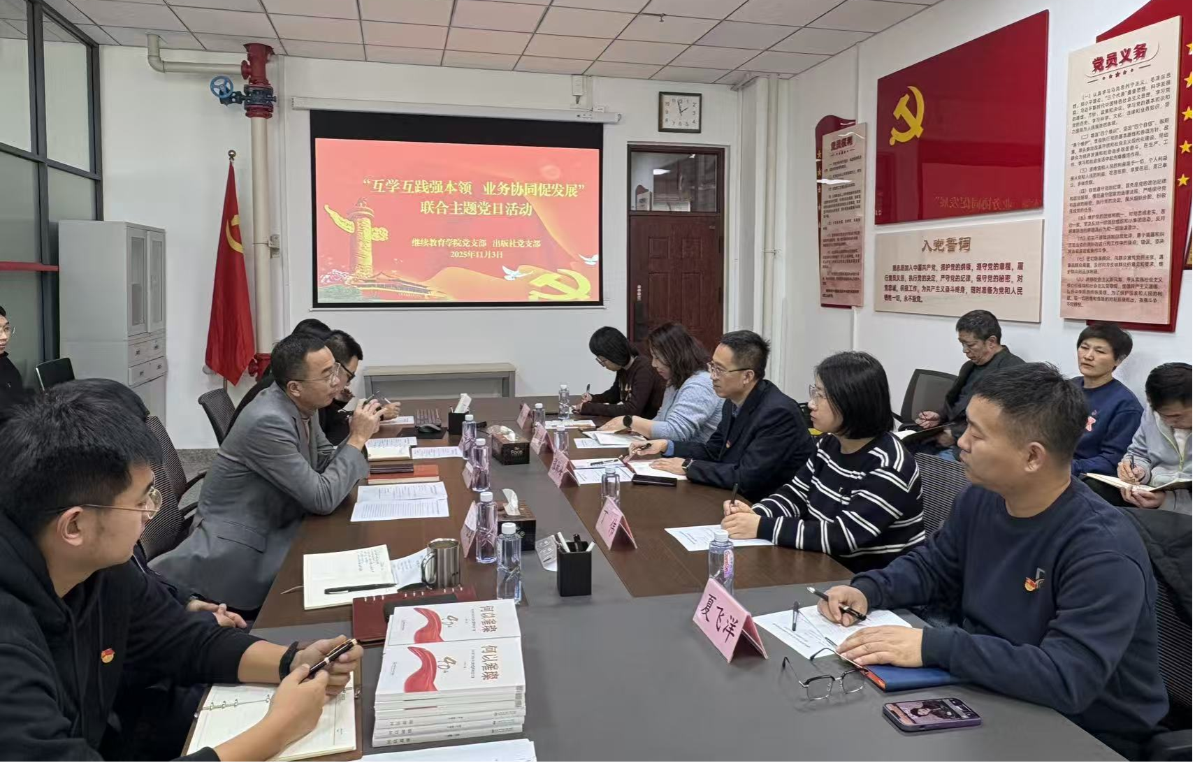 为深入学习贯彻习近平新时代中国特色社会主义思想,推动党建工作与业务发展同频共振、深度融合,11月3日,继续教育学院党支部与出版社党支部联合开展“互学互践强本领 业务协同促发展”主题党日活动。双方在共学中深化思想共识,在共话中擘画发展蓝图,以党建引领凝聚起协同发展的强大合力。