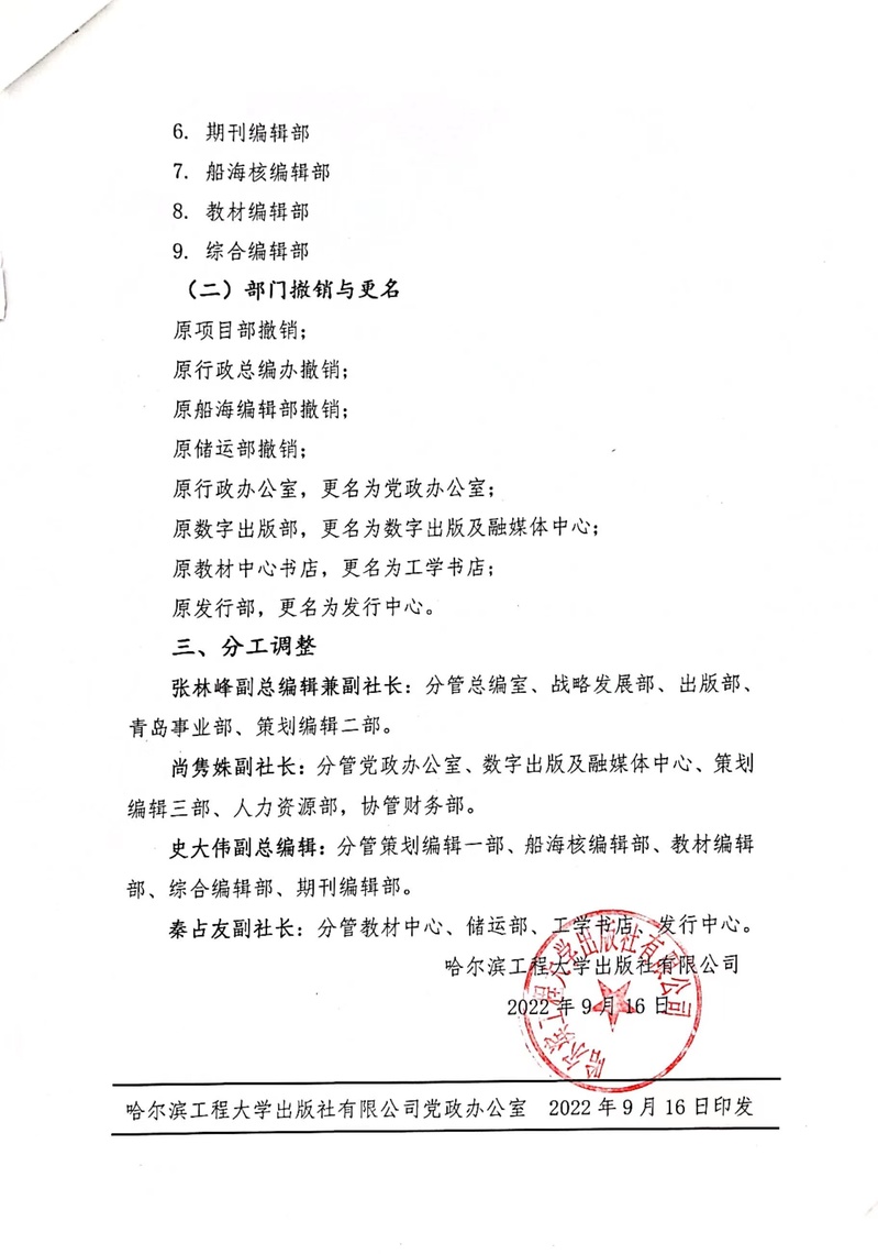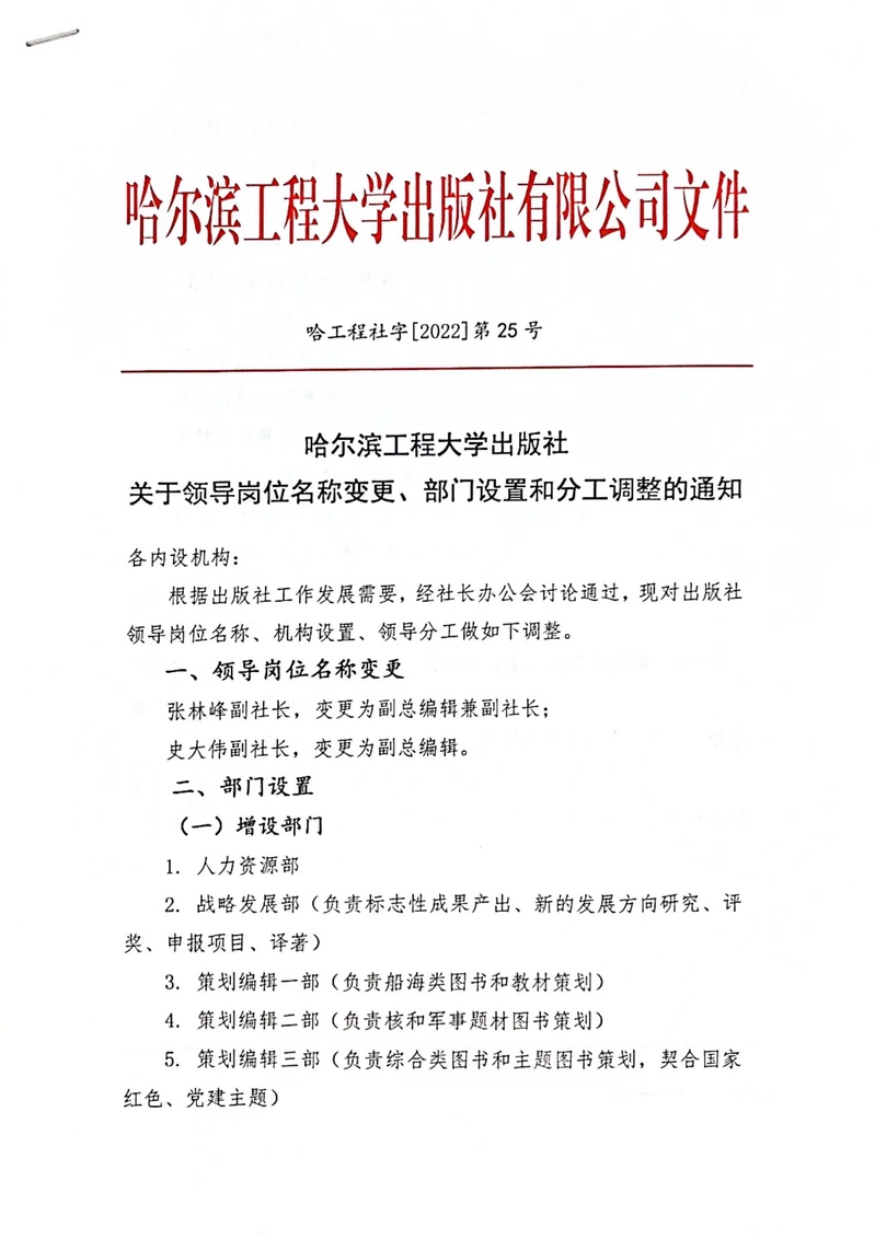 哈尔滨工程大学出版社关于领导岗位名称变更、部门设置和分工调整的通知