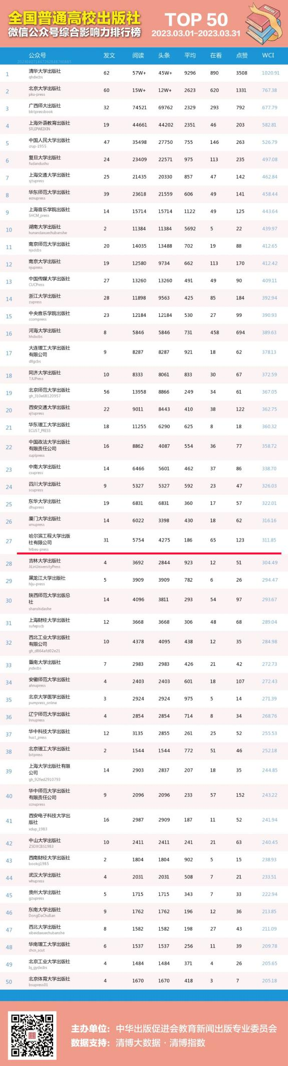 在刚刚发布的3月份“全国普通高校出版社微信公众号影响力排行榜”中,我社微信公众号排名稳步提升,本月上升至第27名!当月共发布文章31条,总阅读量达到5754,头条文章阅读量4275,WCI指数311.85。
