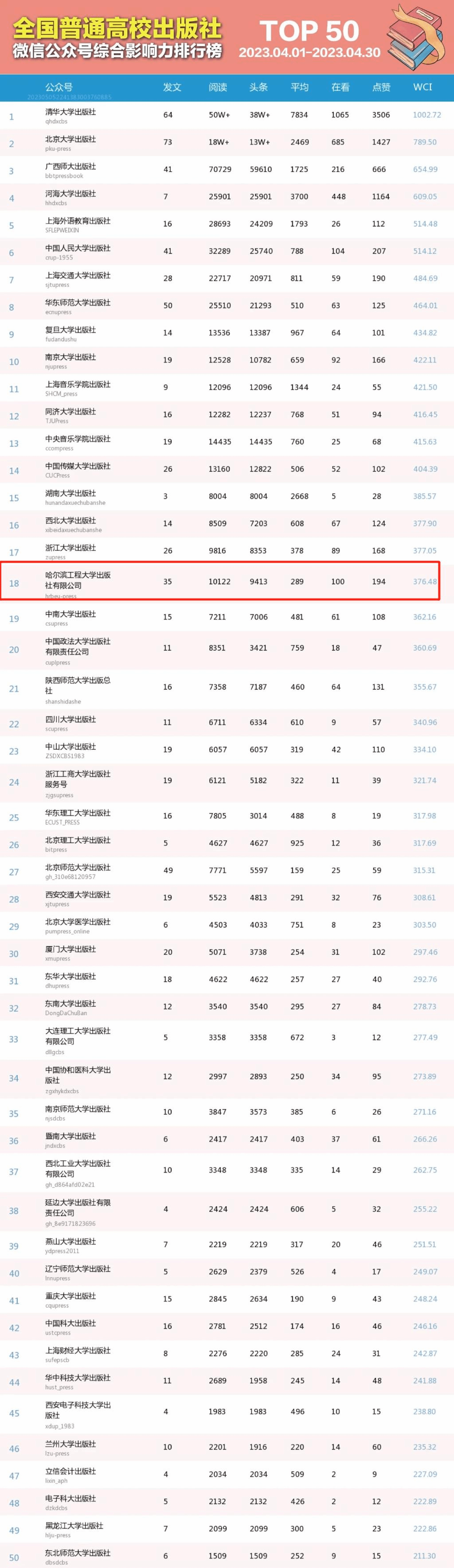 在刚刚发布的4月份“全国普通高校出版社微信公众号影响力排行榜”中,我社微信公众号排名继续提升,本月上升至第18名!当月共发布文章35条,总阅读量达到10122,头条文章阅读量9413,WCI指数376.48。