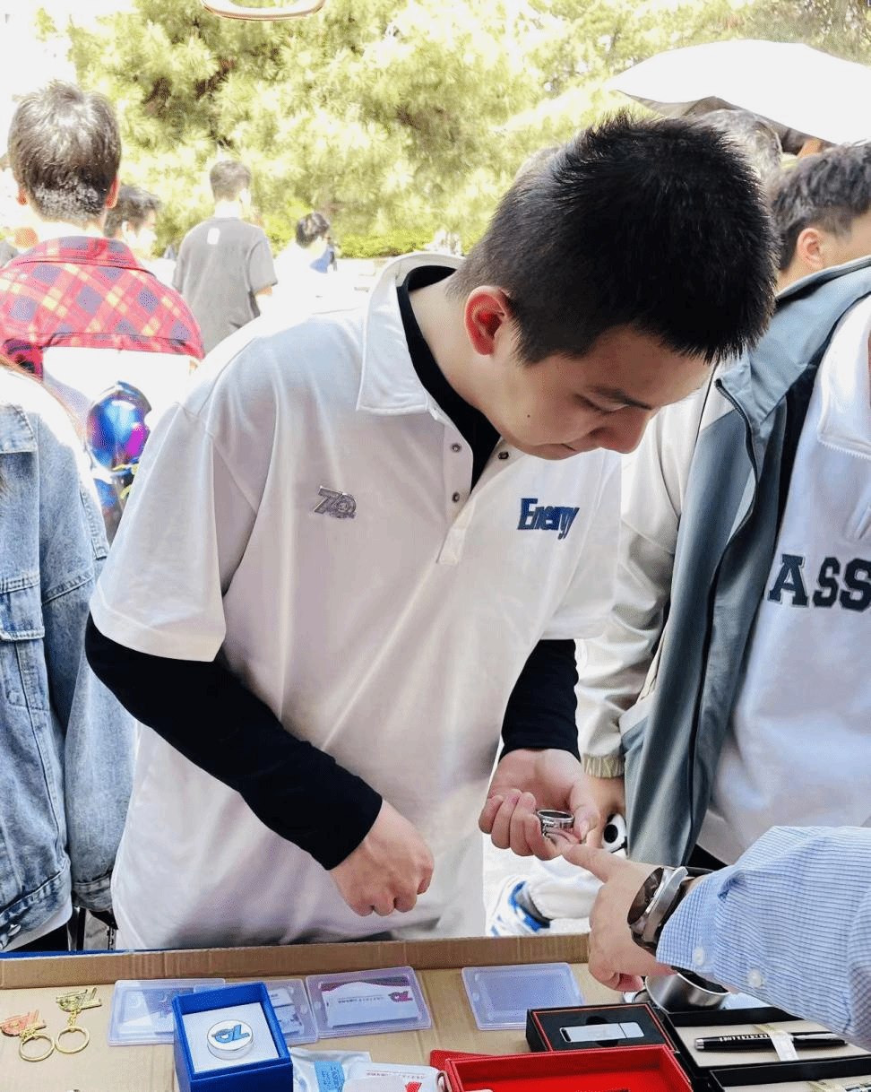 学生迫不及待地将购买到手的70周年校庆徽章佩戴在胸前