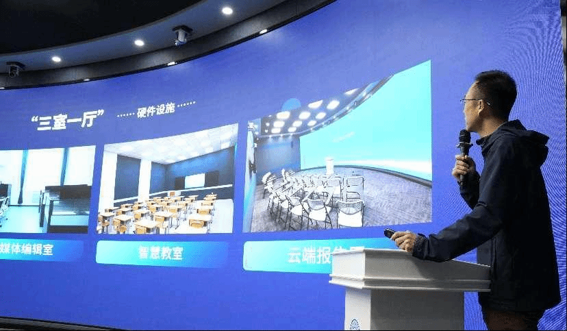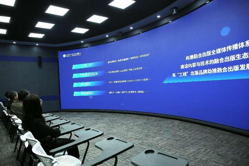 我社融合出版中心主任李雪峰在云端报告厅介绍了“三室一厅”的功能以及融媒体赋能业务。